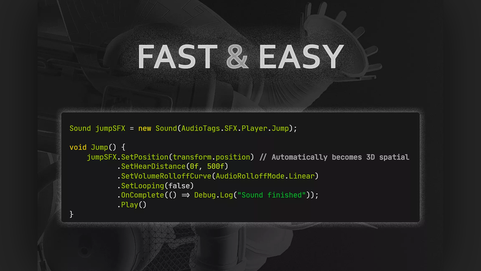 - Type-Safety: The system monitors your project and auto-generates an AudioTags class. You get full autocomplete and compile-time errors if a sound is missing.